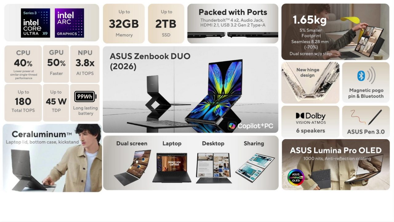 Οι φορητοί υπολογιστές με διπλή οθόνη μέχρι σήμερα ήταν όμορφα και ακριβά γκατζετάκια που οι εταιρείες παρουσίαζαν κυρίως να δείξουν την τεχνολογική τους υπεροχή. Από πλευράς πρακτικότητας φυσικά ούτε συζήτηση να γίνεται. Η ASUS όμως αποφάσισε να κάνει άλλη μια προσπάθεια παρουσιάζοντας το Zenbook DUO 2026, ένα φορητό PC που φαίνεται να λειτουργεί πραγματικά.