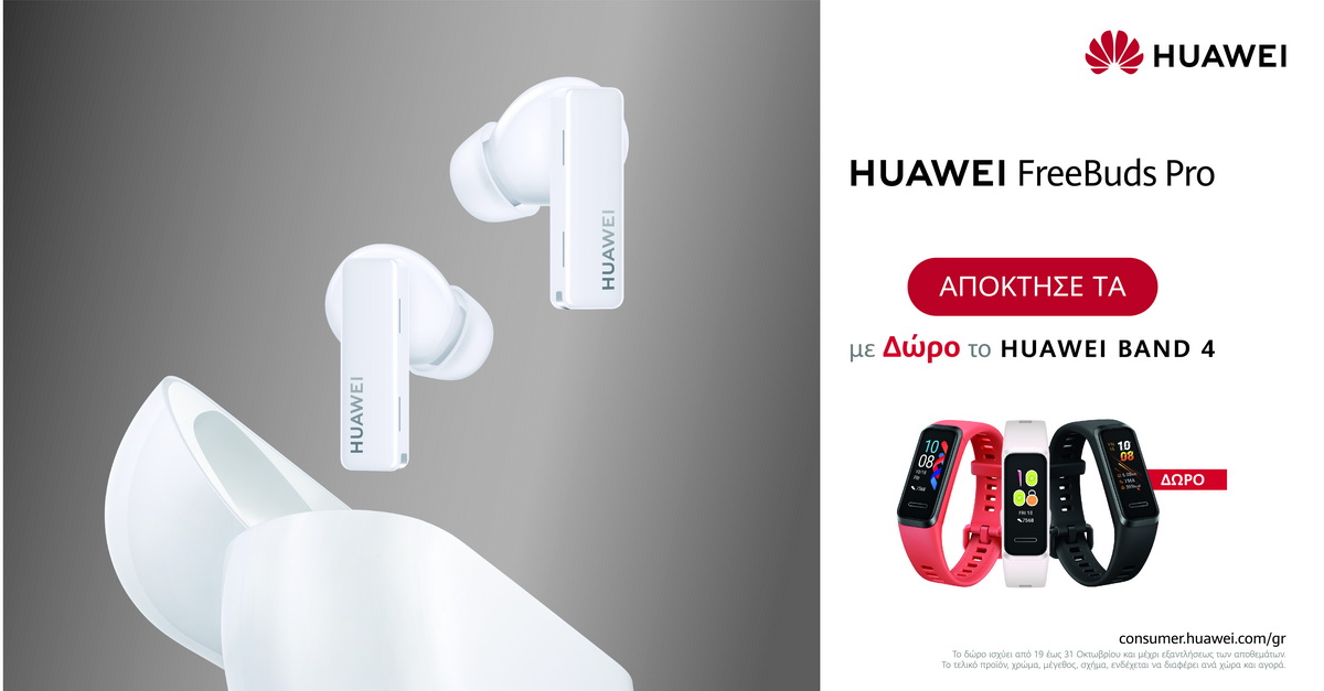 Ένα νέο εκπληκτικό προϊόν καταφθάνει στην ελληνική αγορά: τα Huawei FreeBuds Pro, τα νέα ακουστικά της Huawei και πρώτα wireless ακουστικά στον κόσμο που προσφέρουν έξυπνο dynamic noise cancellation, προσαρμόζοντας τον τρόπο λειτουργίας τους στο περιβάλλον του χρήστη για την ιδανική ακουστική εμπειρία κάθε στιγμή! Διαθέσιμα στην ελληνική αγορά από 19 Οκτωβρίου σε απίθανο χρώμα Ceramic White, τα FreeBuds Pro συνοδεύονται από μία μεγάλη έκπληξη: συγκεκριμένα, μέχρι και τις 31 Οκτωβρίου, με κάθε αγορά Huawei FreeBuds Pro, οι καταναλωτές θα παίρνουν ως δώρο και το fitness-tracking Huawei Band 4, ένα υπέροχο gadget που παρακολουθεί 24 ώρες το 24ωρο τις καθημερινές δραστηριότητες του χρήστη και τον βοηθά να διατηρεί την καλή του φυσική κατάσταση και να προστατεύει την υγεία του.