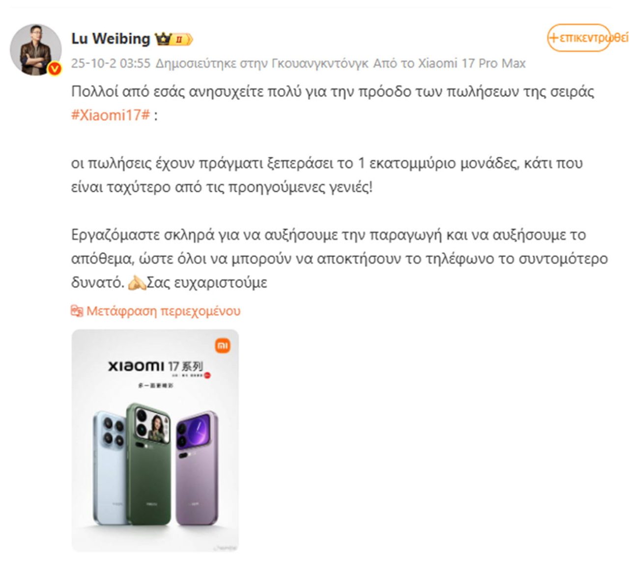 Σε μια πραγματικά εντυπωσιακή εξέλιξη, η σειρά Xiaomi 17 ξεπέρασε επίσημα το 1 εκατομμύριο πωλήσεις, επιτυγχάνοντας αυτό το νούμερο πιο γρήγορα από οποιονδήποτε προηγούμενο κινητό!