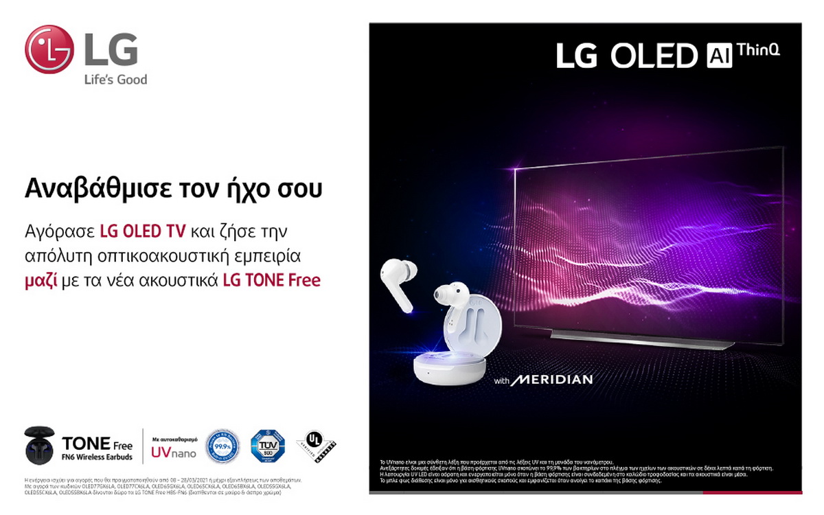 Η LG φέρνει την απόλυτη οπτικοακουστική εμπειρία στο σαλόνι σας, μέσα από τη νέα προωθητική της ενέργεια, που υλοποιείται από τις 8 έως και τις 28 Μαρτίου 2021 . Το συγκεκριμένο διάστημα, οι καταναλωτές θα έχουν τη δυνατότητα να αποκτήσουν δωρεάν τα ασύρματα ακουστικά LG Tone Free FN6, με την αγορά των μοντέλων τηλεοράσεων OLED77GX6LA, OLED77CX6LA, OLED65GX6LA, OLED65CX6LA, OLED65BX6LA, OLED55GX6LA, OLED55CX6LA, ή OLED55BX6LA.