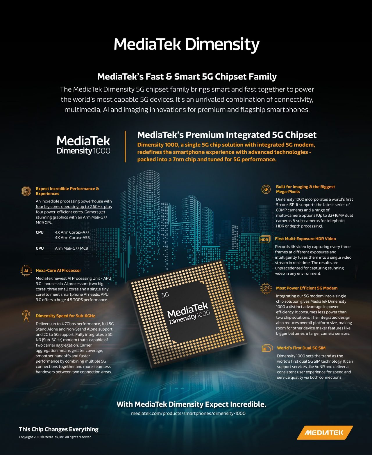 Το Dimensity κατασκευάζεται με διαδικασία 7 nanometer FinFET, και ενσωματώνει τον επεξεργαστή Cortex-A77 και το chip γραφικών Mali-G77. Σύμφωνα με την MediaTek θα έρθει στην αγορά το πρώτο τρίμηνο του 2020. Να σας θυμίσουμε ότι αυτή την στιγμή το μοναδικό SoC με ενσωματωμένο 5G modem είναι ο Kirin 990 της Huawei!