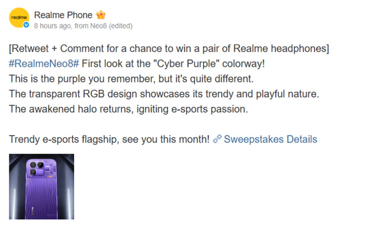 Το Realme Neo8 Cyber Purple υιοθετεί ένα διάφανο RGB σχεδιασμό και επαναφέρει το εμβληματικό σχεδιαστικό στοιχείο “awakening halo” της εταιρείας. Η realme περιγράφει-με την απαραίτητη εταιρική υπερβολή-τη συσκευή ως ένα «αριστούργημα που θα ξεπεράσει τον ανταγωνισμό στις αρχές του έτους», επιβεβαιώνοντας την κυκλοφορία εντός αυτού του μήνα.