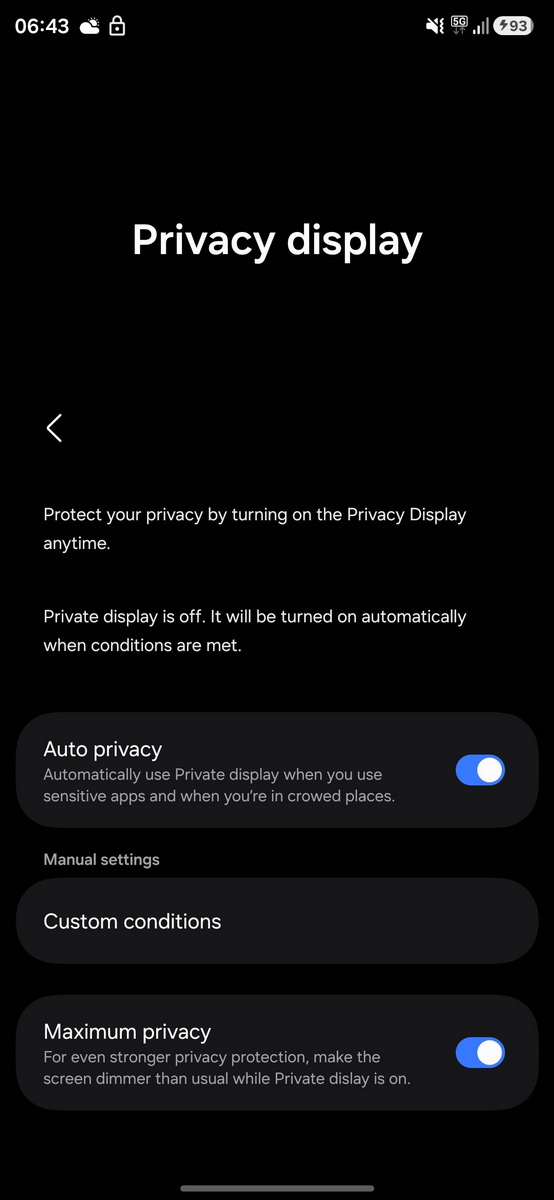 Σύμφωνα με τα screenshots, οι χρήστες θα έχουν την επιλογή να προσαρμόσουν την ένταση του εφέ και να ορίσουν συγκεκριμένες συνθήκες για το πότε θα ενεργοποιείται. Η Samsung φαίνεται να προετοιμάζει αυτόματες ενεργοποιήσεις, όπως η ανίχνευση του πότε βρίσκεστε σε πολυσύχναστο μέρος, όπως ένα λεωφορείο, ένα τρένο ή ένα καφέ, και στη συνέχεια να μειώνει την ορατότητα της οθόνης από τα πλάγια.