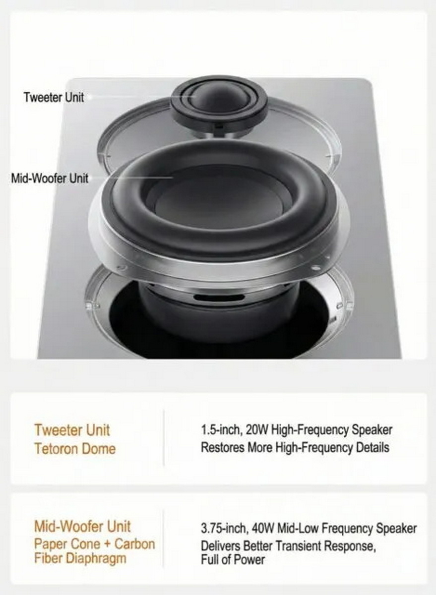 Το ηχείο χρησιμοποιεί μια διάταξη διπλού crossover με ξεχωριστά ηχεία για μεσαίες και υψηλές συχνότητες. Ως αποτέλεσμα το ηχείο μπορεί να προσφέρει καθαρές υψηλές συχνότητες αλλά και αρκετά δυνατές χαμηλές από το γούφερ των 40W και το τουίτερ των 20W.